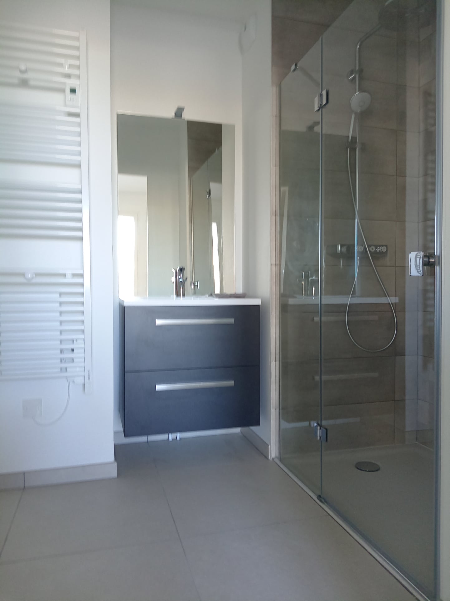 Il se compose d’une entrée avec placard aménagé, toilettes séparés, d’une pièce de vie lumineuse avec cuisine ouverte équipée de plaques, four et hotte et d’une chambre avec salle de douche attenante.